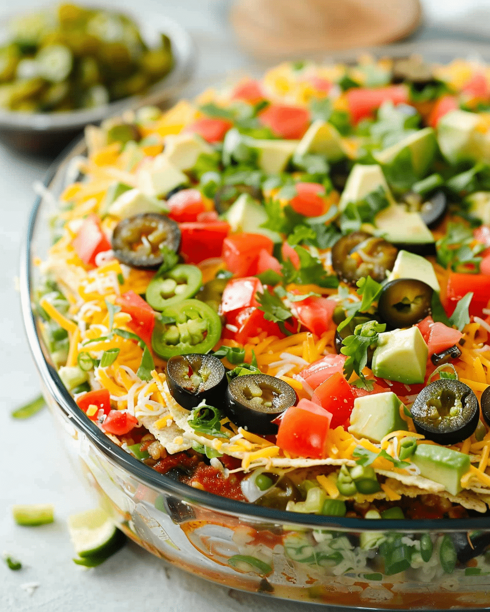 For a spicy kick, add sliced jalapeños or a layer of spicy salsa.For a meat lover’s version, include a layer of cooked ground beef seasoned with taco seasoning.Make it vegetarian by using vegetarian refried beans and omitting any meat layers.To make dairy-free, substitute sour cream with a dairy-free alternative and use plant-based cheese.