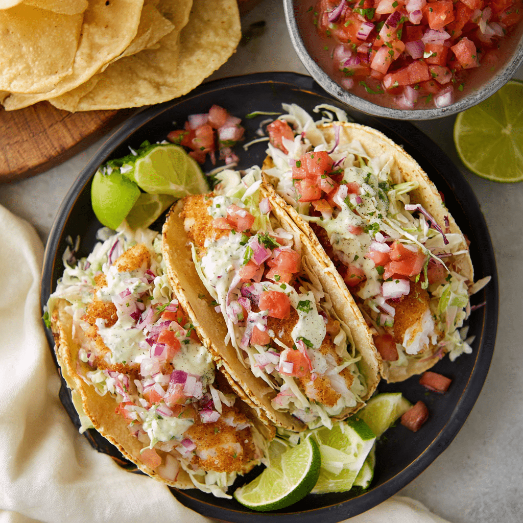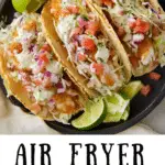 These air fryer Baja fish tacos are crispy, flavorful, and healthier than traditional fried tacos. Made with seasoned white fish, crunchy slaw, and creamy sauce, this easy taco recipe is perfect for quick dinners and taco nights.