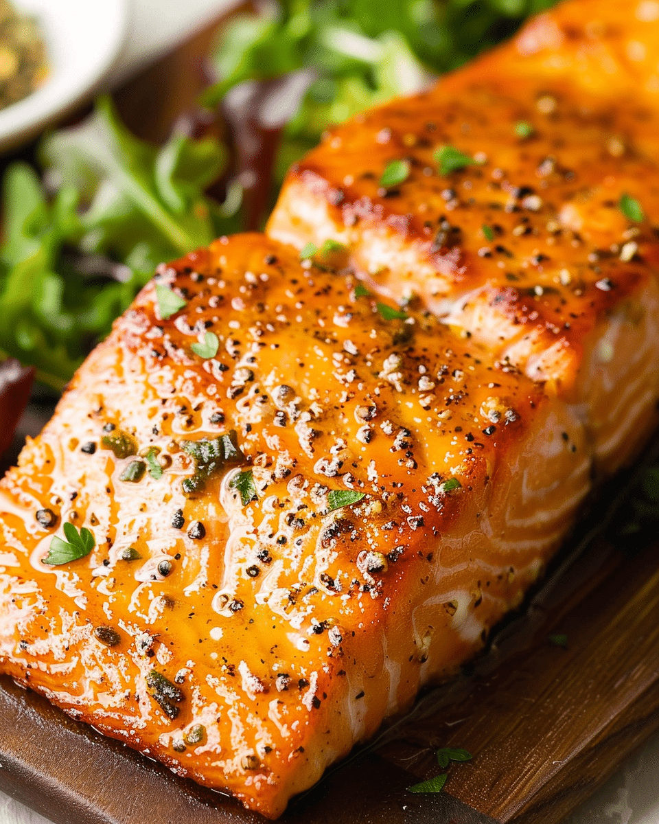 salmon fillets, skin-on or skinless olive oil garlic powder paprika lemon juice salt black pepper fresh parsley or dill for garnish (optional) lemon wedges for serving