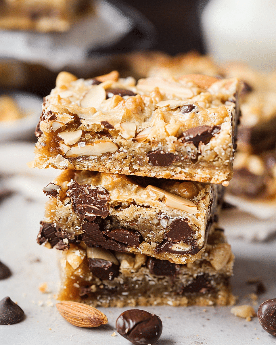 Use dark or semi-sweet chocolate for a richer taste.Toast coconut or almonds before adding for extra depth of flavor.Omit almonds for a nut-free version or substitute with other nuts.Let bars cool fully before slicing for clean edges.Bars freeze well and can be stored for up to 2–3 months.