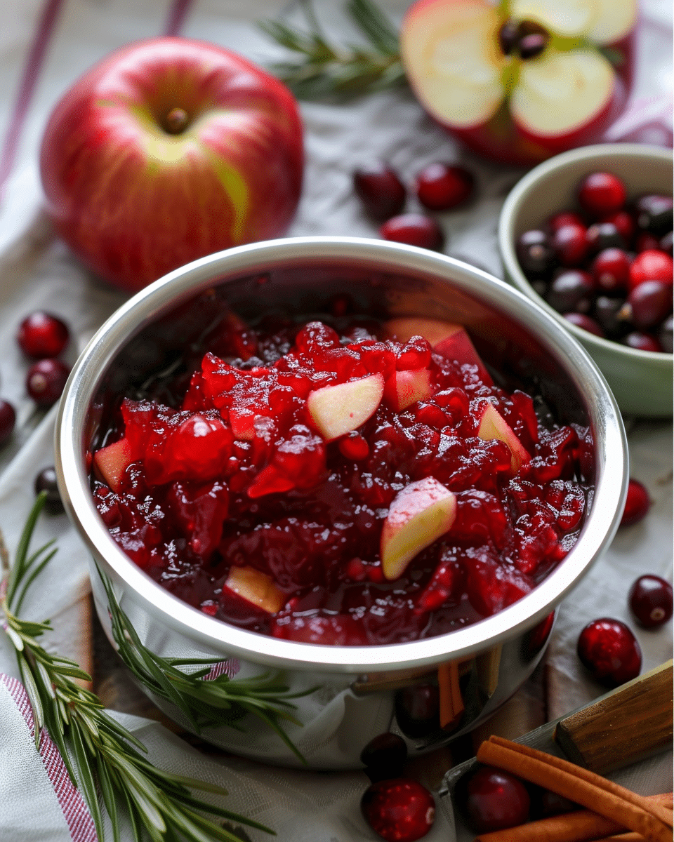 Use tart apples like Granny Smith or Honeycrisp for best results.Frozen cranberries can be used straight from the freezer—no need to thaw.Add orange or lemon zest for a citrus twist.For a spicier version, include chopped jalapeño or red pepper flakes.Chutney thickens as it cools; add a splash of juice or water to loosen if needed.
