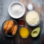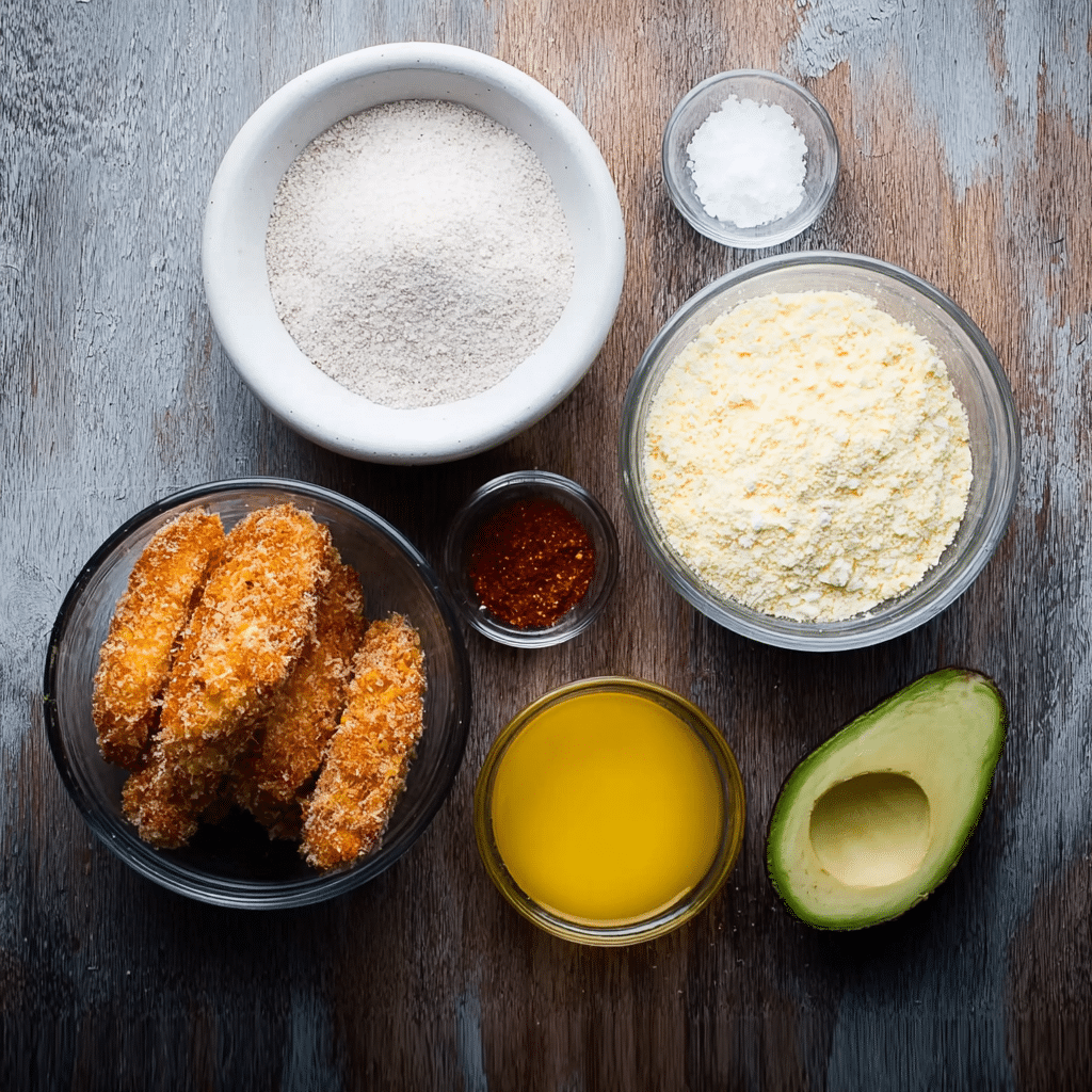 (Tip: You’ll find the full list of ingredients and measurements in the recipe card below.) 2 ripe but firm avocados 1 cup breadcrumbs (panko works best) 1/2 cup all-purpose flour 2 eggs 1/2 teaspoon salt 1/2 teaspoon black pepper 1/2 teaspoon paprika 1/2 teaspoon garlic powder Cooking spray or oil for baking/frying