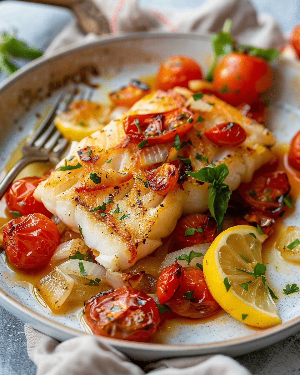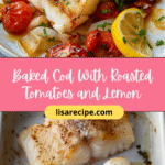 Baked Cod with Roasted Tomatoes and Lemon is a fresh, Mediterranean-inspired dish featuring flaky cod fillets baked alongside sweet cherry tomatoes, zesty lemon, and aromatic herbs. It’s a healthy, one-pan meal that’s perfect for a quick dinner or an elegant occasion.