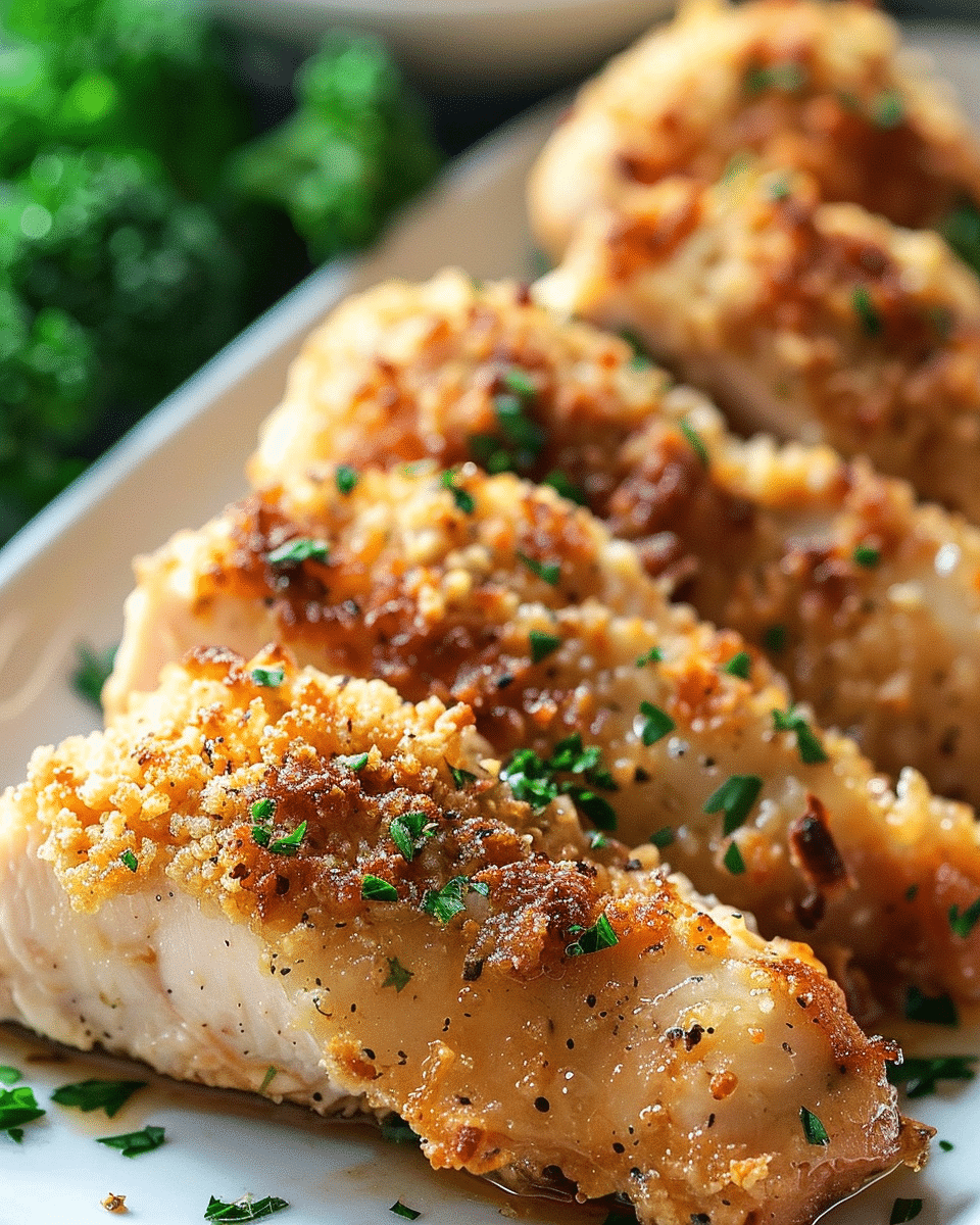 A crispy, juicy, and flavorful baked chicken coated in garlic, parmesan, and breadcrumbs. This healthier oven-baked version is easy to prepare and makes a perfect weeknight dinner.