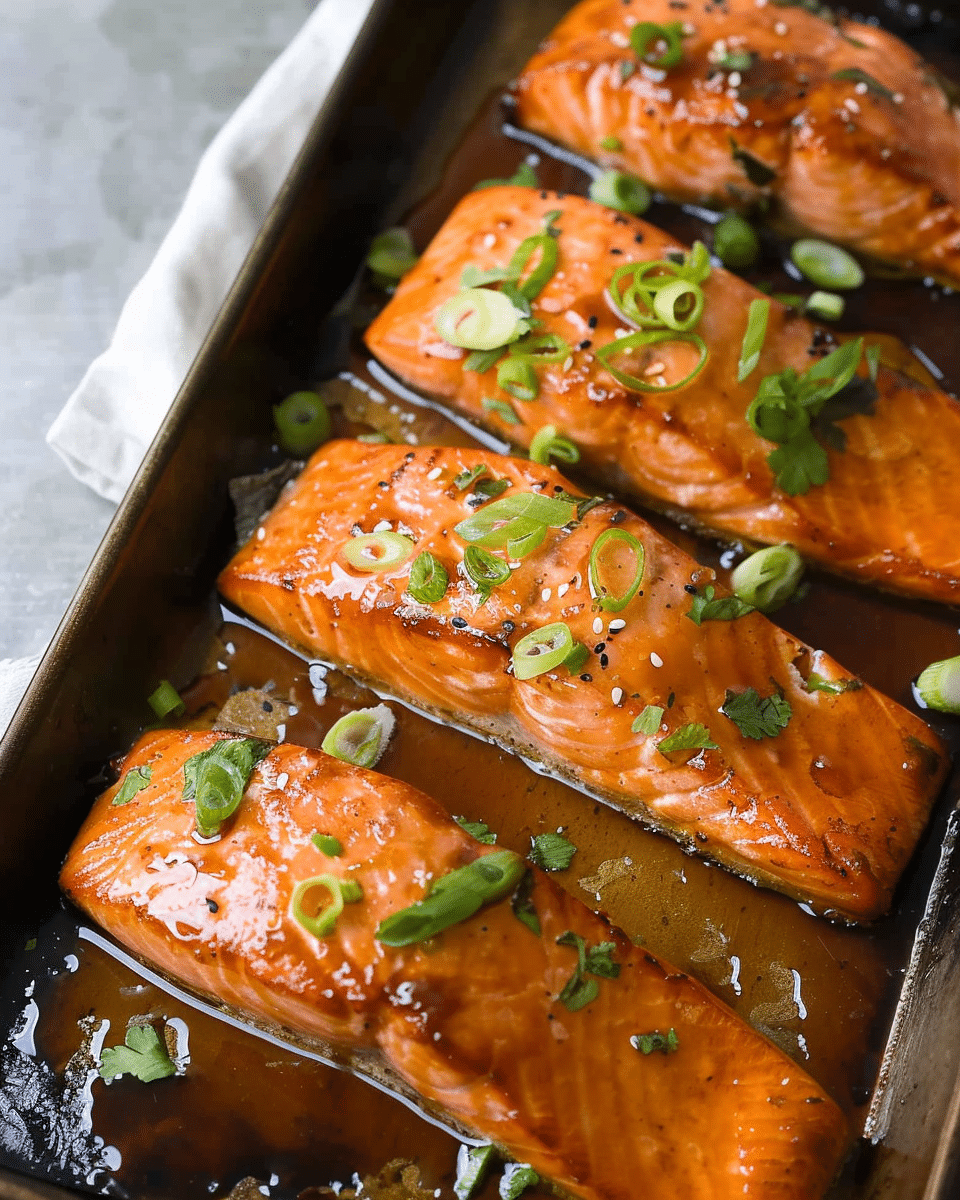 Bake for 12–15 minutes, depending on the thickness of your fillets, until the salmon flakes easily with a fork and the glaze is slightly caramelized.