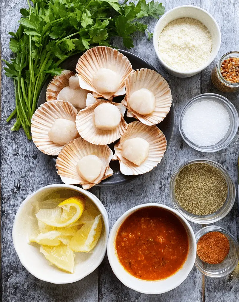 (Tip: You’ll find the full list of ingredients and measurements in the recipe card below.) 1 pound sea scallops 2 tablespoons melted butter 2 cloves garlic, minced 1/2 cup breadcrumbs 1/4 cup grated parmesan cheese 1 tablespoon fresh parsley, chopped 1 tablespoon lemon juice 1/2 teaspoon salt 1/2 teaspoon black pepper