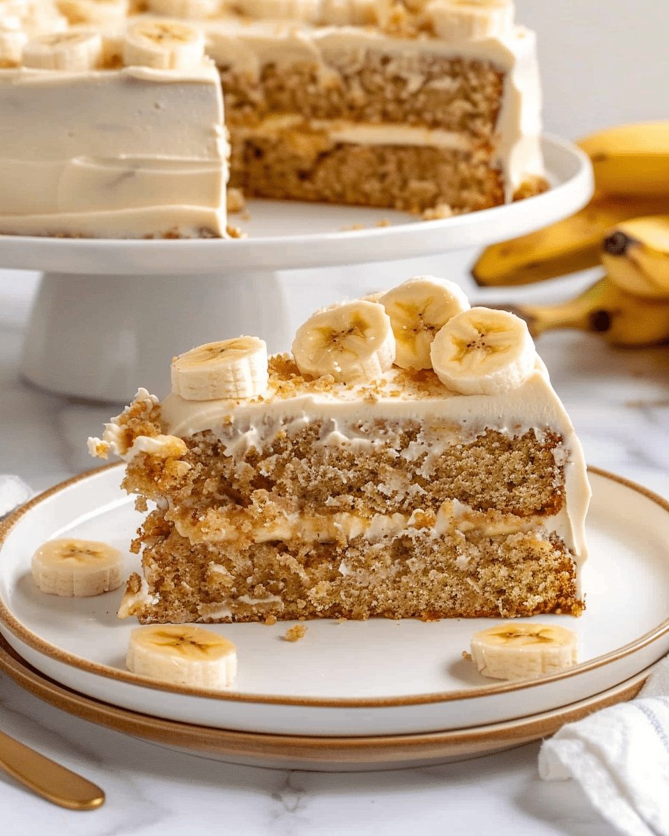 Use very ripe bananas with brown spots for best flavor and moisture.Add cream cheese frosting for a classic finish.Turn into cupcakes or muffins by adjusting bake time to 18–22 minutes.To freeze, wrap slices or the whole cake tightly and store for up to 3 months.Substitute eggs with applesauce or flax eggs for an eggless version.