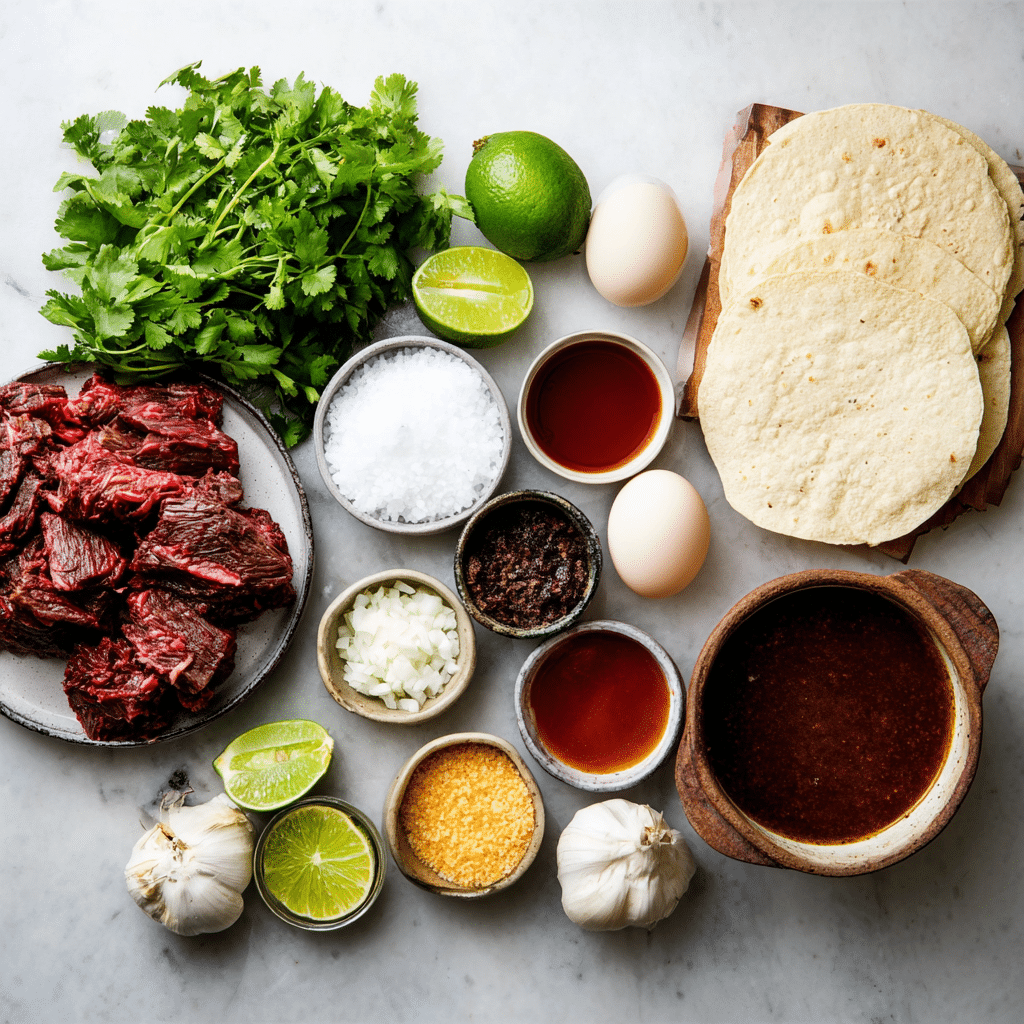 For the Birria: 2 lbs (900 g) beef chuck roast or short ribs, cut into chunks 4 dried guajillo chiles, stemmed and seeded 2 dried ancho chiles, stemmed and seeded 2 chipotle peppers in adobo 1 medium onion, chopped 4 cloves garlic 3 medium tomatoes 2 cups beef broth 2 tablespoons apple cider vinegar 2 bay leaves 1 teaspoon cumin 1 teaspoon dried oregano 2 cloves 1 small piece cinnamon stick Salt and black pepper, to taste 2 tablespoons oil