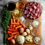 (Tip: You’ll find the full list of ingredients and measurements in the recipe card below.) beef (chuck or stewing beef, cut into chunks) potatoes (peeled and chopped) carrots (sliced) onion (chopped) garlic (minced) beef broth tomato paste flour (for thickening) olive oil salt black pepper bay leaves thyme (optional)