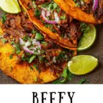 Beefy Birria Tacos are rich, crispy tacos filled with slow-cooked shredded beef simmered in a deeply flavorful chili consommé, served with fresh toppings and dipping broth.