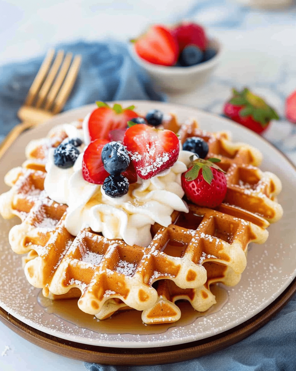 Belgian waffles are a delightful and versatile breakfast option that never goes out of style. With a crispy, golden exterior and a fluffy interior, they are the perfect base for all your favorite toppings, from fresh fruit and syrup to whipped cream and chocolate chips. This simple recipe makes it easy to enjoy homemade Belgian waffles anytime, whether you’re serving them for a special brunch or enjoying them on a lazy weekend morning. Enjoy the perfect waffle every time!