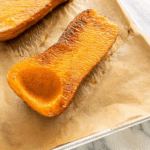 Cut the butternut squash in half lengthwise, scoop out the seeds, and place it cut-side down on a baking sheet lined with parchment paper.