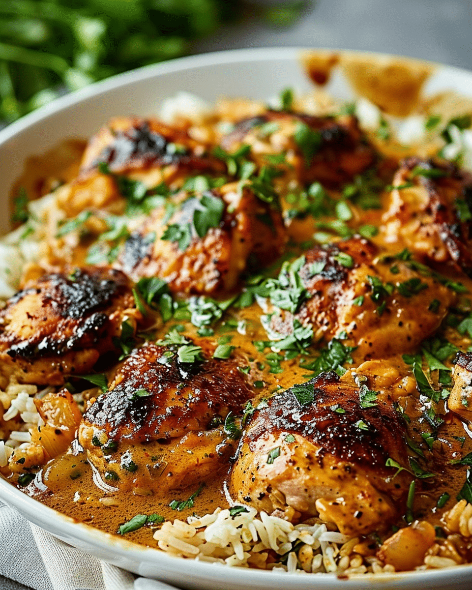 Smothered Chicken and Rice is a Southern-inspired comfort dish featuring seasoned chicken thighs simmered in rich onion gravy, served over fluffy long-grain rice. Perfect for cozy dinners and family meals.