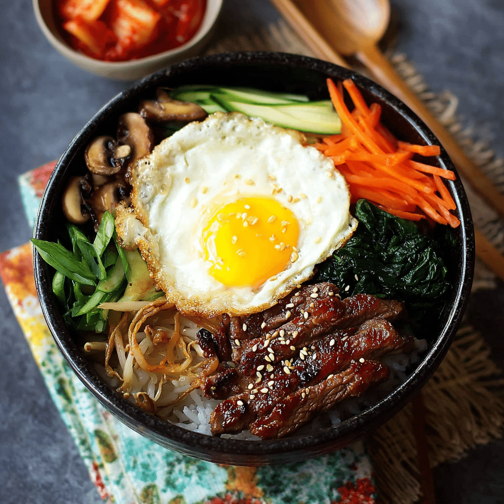 Bibimbap is a colorful and nutritious Korean rice bowl topped with an assortment of sautéed vegetables, protein, a fried egg, and a bold gochujang-based sauce. It’s a customizable, balanced, and deeply satisfying meal.