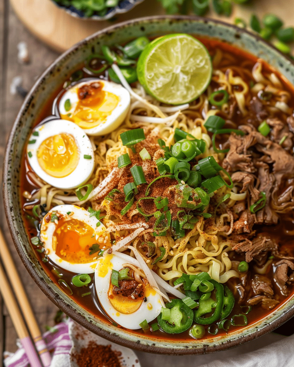 Serve Birria Ramen with lime wedges, fresh cilantro, and crispy corn tortillas on the side for dipping into the flavorful broth.