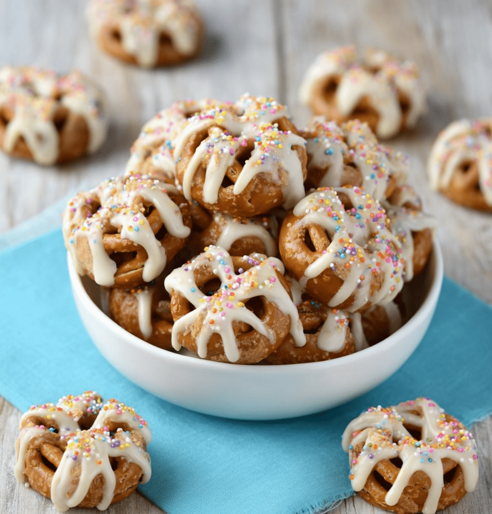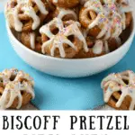 mini pretzels Biscoff spread (cookie butter) white chocolate chips or melted white chocolate coconut oil (optional, for smoother melting) sprinkles or crushed pretzels (optional topping)