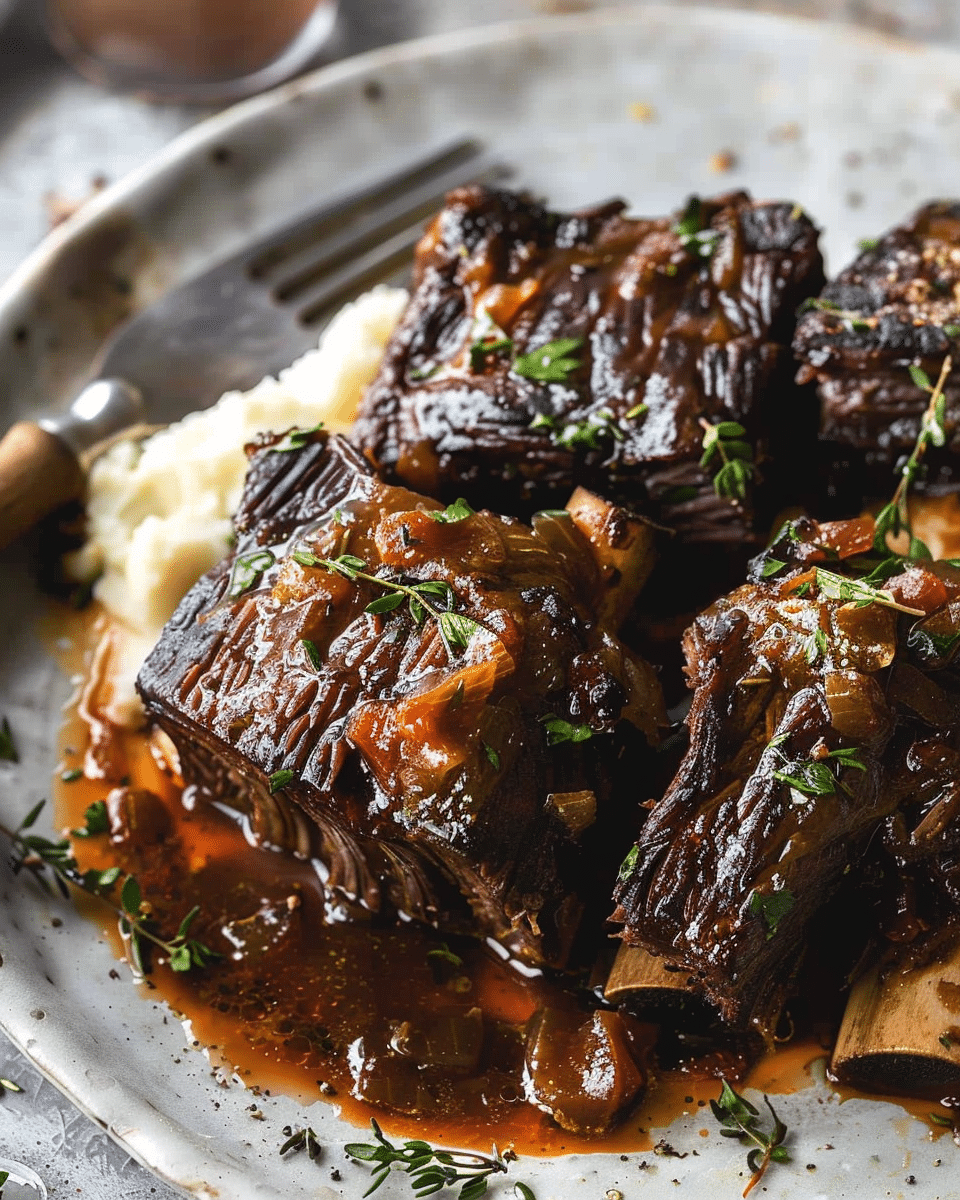 Use bone-in ribs for the best flavor and texture.The dish can be made a day ahead — flavors improve after resting overnight.To reduce sauce, simmer uncovered until desired consistency is reached.Serve with mashed potatoes, polenta, or crusty bread to soak up the sauce.For a lighter version, substitute red wine with more broth or white wine.