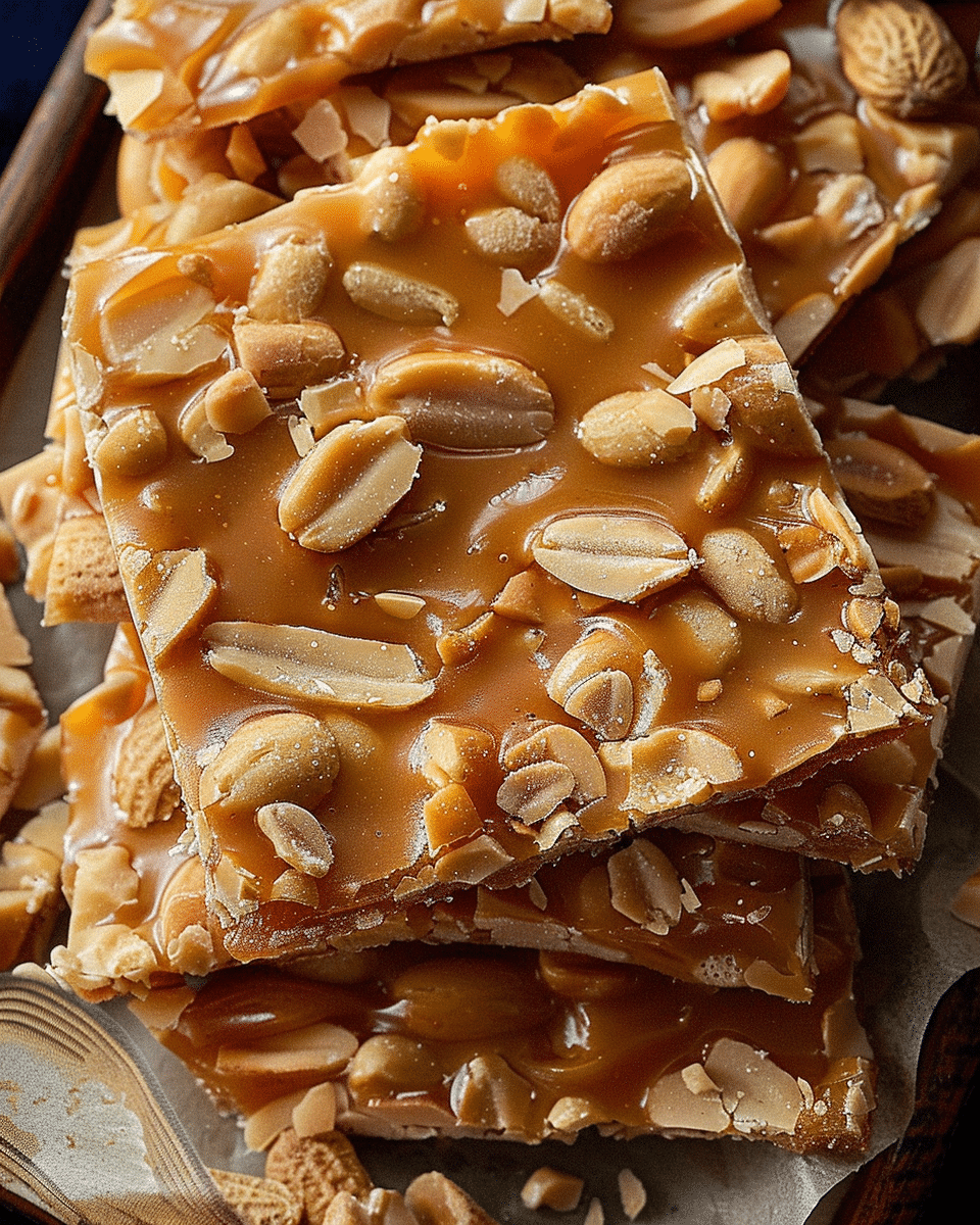 Store the peanut brittle in an airtight container at room temperature for up to 2 weeks. Keep it in a cool, dry place to prevent the sugar from becoming sticky. Avoid refrigerating, as moisture can ruin the texture. No reheating is necessary — just break off a piece and enjoy.