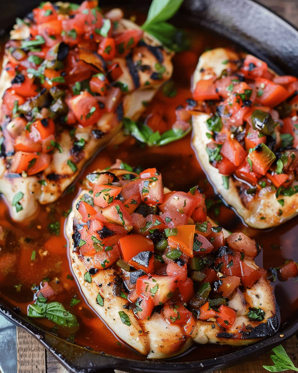 Bruschetta Chicken is a light, flavorful, and easy-to-make meal that’s packed with fresh ingredients and Mediterranean flair. With tender, perfectly cooked chicken topped with a vibrant, tangy bruschetta mixture, this dish is a crowd-pleaser that’s sure to impress. Whether you’re looking for a quick weeknight dinner or a dish for special occasions, Bruschetta Chicken is the perfect balance of fresh, savory, and satisfying flavors. It’s simple, yet deliciously memorable—your taste buds will thank you!