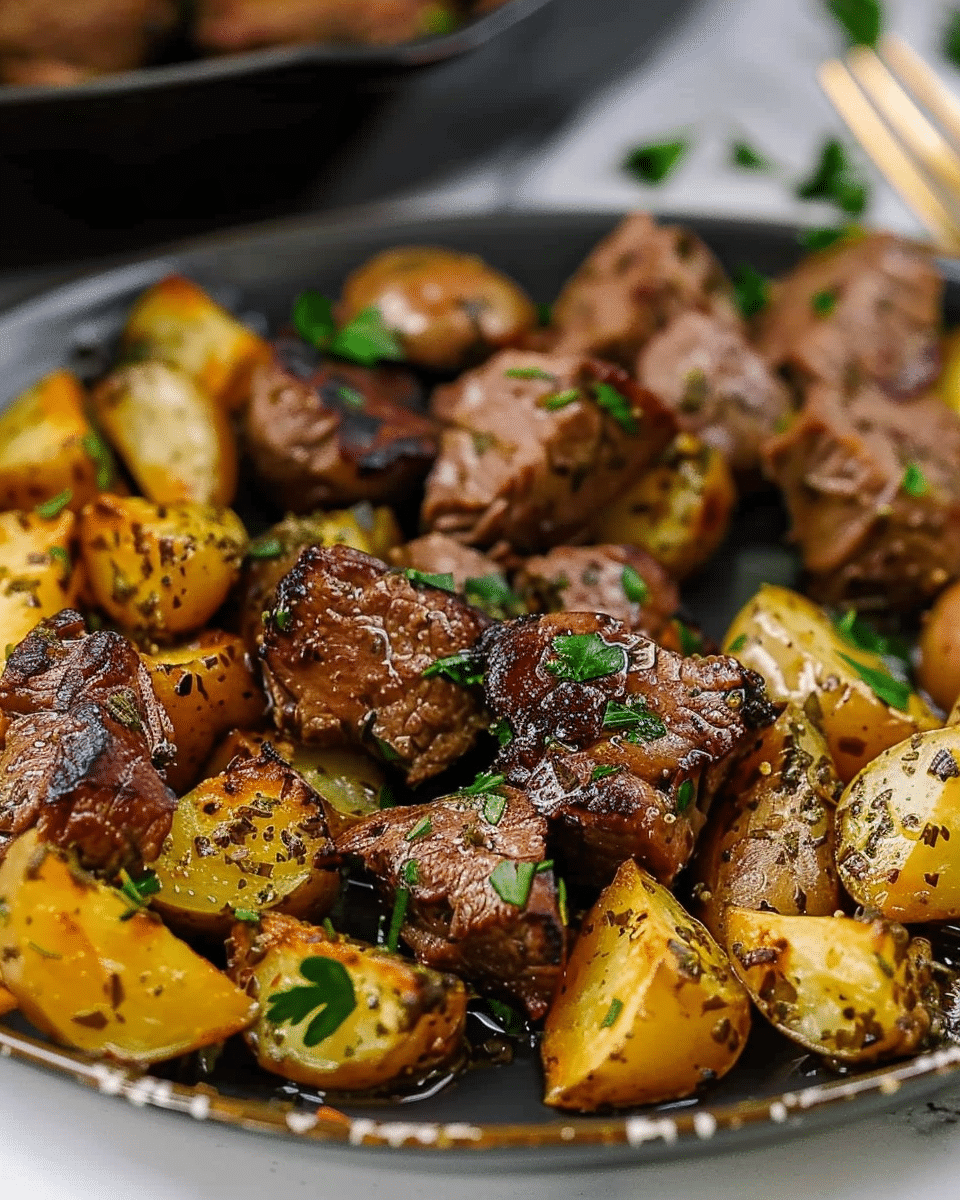 Butter Steak Bites with Garlic Herb Potatoes is a mouthwatering, indulgent dish featuring tender, juicy steak bites seared to perfection and paired with crispy, flavorful garlic herb potatoes. The steak is cooked in a rich butter sauce, making each bite melt-in-your-mouth tender, while the potatoes are tossed with fresh herbs, garlic, and butter for a savory side. This dish is perfect for a weeknight dinner or special occasion, offering a satisfying combination of textures and flavors.