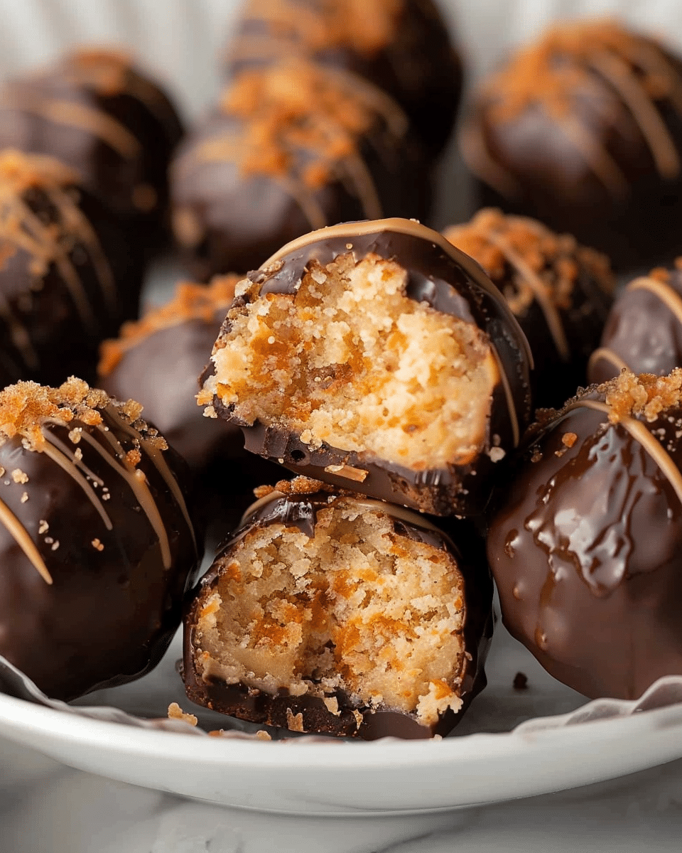 Chill mixture briefly if too soft to roll into balls.For a white chocolate version, dip in melted white chocolate instead.Sprinkle extra crushed Butterfinger on top before the chocolate sets for added crunch.These freeze well for up to 3 months—thaw in fridge before serving.Best served cold or at room temperature—no reheating required.