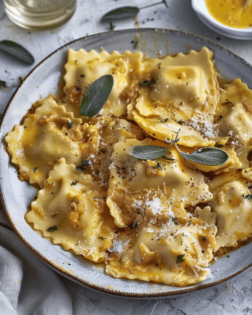 A creamy sage or butter-based sauce pairs beautifully with the sweetness of butternut squash ravioli.