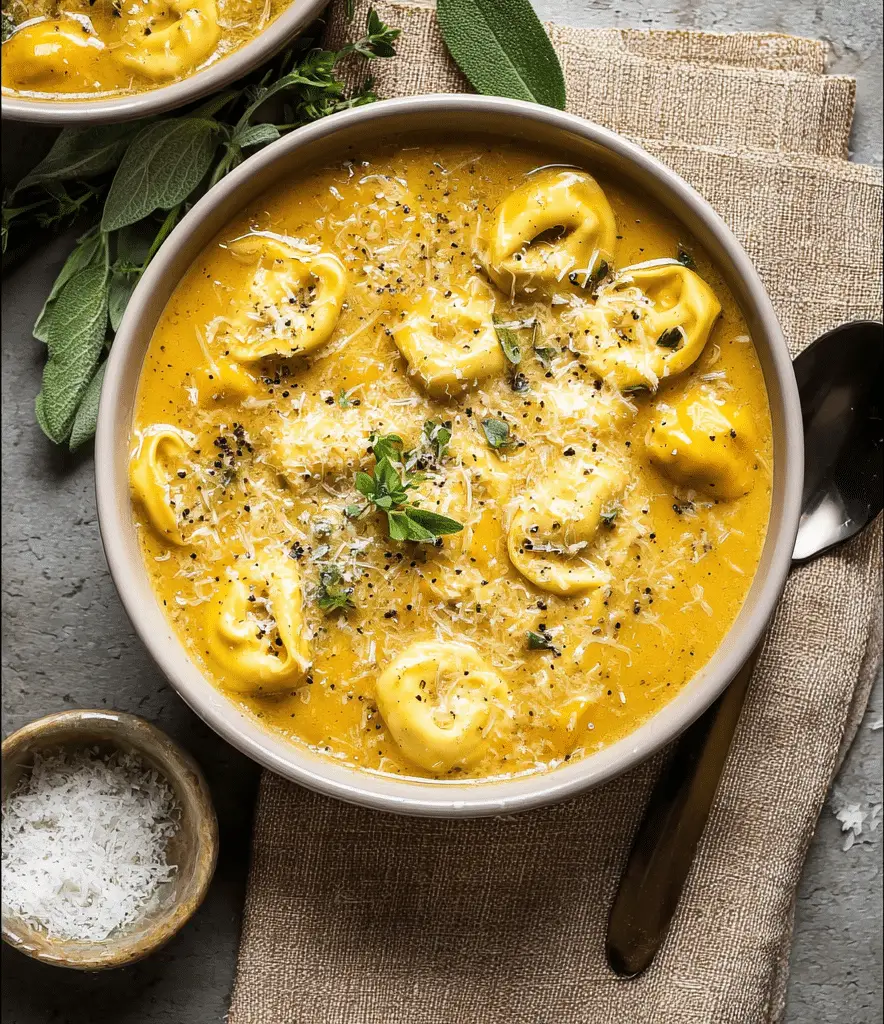 This Butternut Squash Tortellini Soup is a creamy, comforting fall favorite made with sweet butternut squash, tender cheese tortellini, and aromatic herbs simmered in a velvety broth. Perfect for cozy weeknights or elegant gatherings, this Butternut Squash Tortellini Soup delivers rich flavor and satisfying texture in every spoonful.
