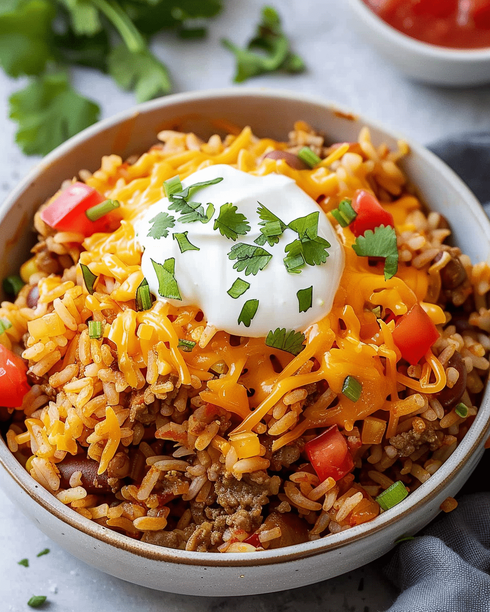 Cheesy Taco Rice is a hearty one-pan dinner featuring seasoned ground beef, tender rice, zesty taco spices, and plenty of melted cheese. It’s quick, comforting, and customizable — perfect for busy weeknights.