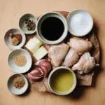 (Tip: You’ll find the full list of ingredients and measurements in the recipe card below.) chicken thighs or drumsticks soy sauce white vinegar garlic bay leaves black peppercorns onion water brown sugar oil