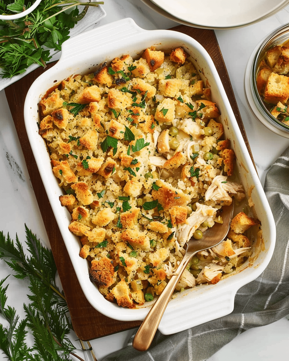 Chicken and Stuffing Casserole is a simple, comforting dish that’s perfect for busy nights, potlucks, or holiday gatherings. With its creamy chicken filling and golden stuffing topping, it’s a satisfying meal the whole family will love. Easy to customize and even easier to make ahead, it’s sure to become a go-to recipe in your kitchen.