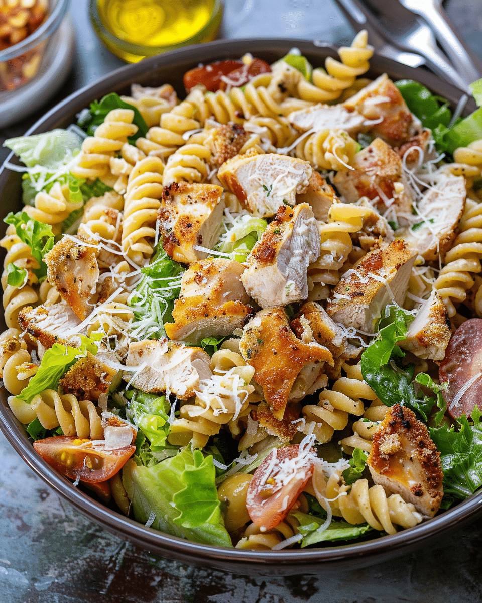 Chicken Caesar Pasta Salad is a perfect blend of flavors and textures. The combination of tender chicken, al dente pasta, and crisp lettuce mixed with creamy dressing makes every bite a satisfying experience. The addition of crunchy croutons and Parmesan cheese elevates the dish and makes it feel indulgent without being heavy. This salad is versatile, so it can be served as a main course for a quick lunch or as a side for a larger meal. Plus, it’s easy to make ahead of time and stores well in the fridge, making it an excellent option for meal prep or potlucks.