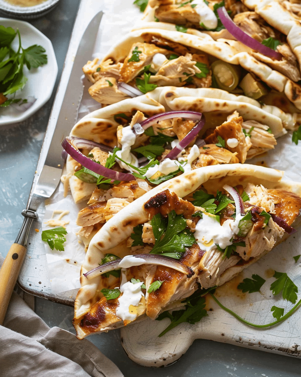 Chicken Pitas are a delicious, quick, and customizable meal made with tender grilled or roasted chicken, fresh vegetables, and a creamy yogurt sauce all wrapped in a soft pita bread. Perfect for lunch, dinner, or a casual meal.