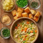 This Chicken Pot Pie Soup with Puff Pastry Croutons is a creamy, comforting dish packed with tender chicken, hearty vegetables, and a rich, velvety broth. Topped with golden, flaky puff pastry croutons, this easy chicken pot pie soup delivers all the classic flavors you love in a cozy, spoonable form—perfect for weeknight dinners or cold-weather comfort meals.