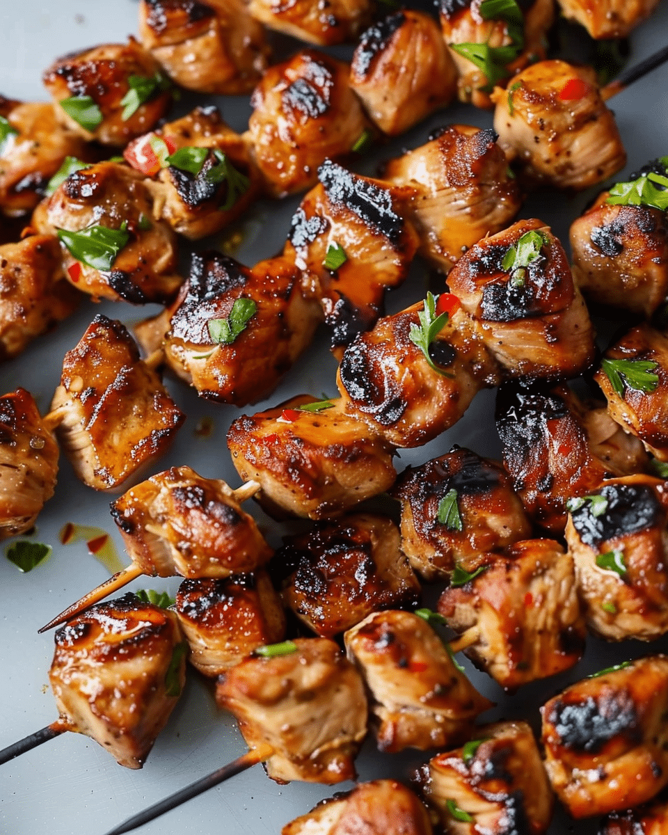 Grill or bake skewers for 10–15 minutes, turning halfway through, until chicken is fully cooked and lightly charred.