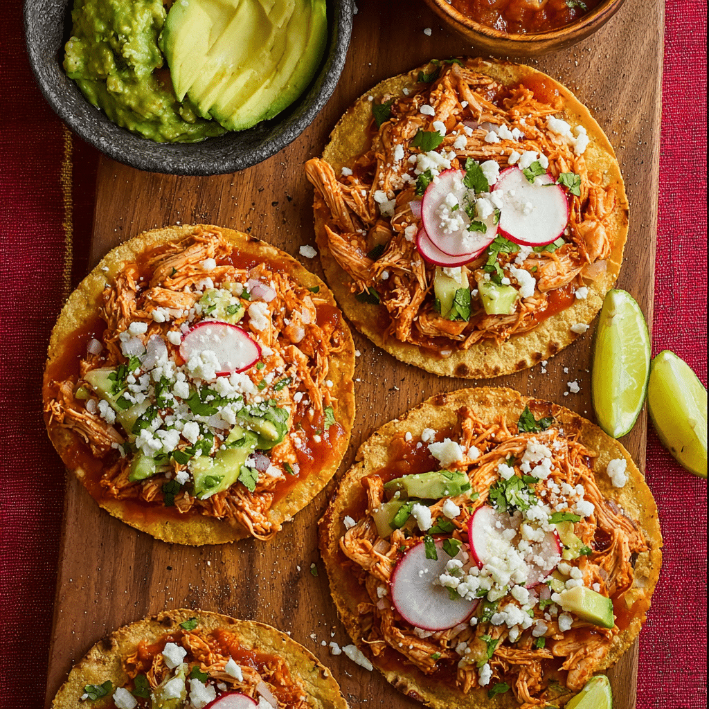 Chicken Tinga Tostadas feature tender shredded chicken simmered in a smoky chipotle-tomato sauce, served on crispy tostada shells and topped with fresh, flavorful garnishes.