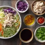 For the Salad: 2 cups cooked chicken, shredded 3 cups green cabbage, shredded 1 cup red cabbage, shredded 1 cup carrots, julienned 1/2 cup cucumber, sliced 2 green onions, chopped 1/4 cup fresh cilantro, chopped 1/4 cup sliced almonds or crispy noodles