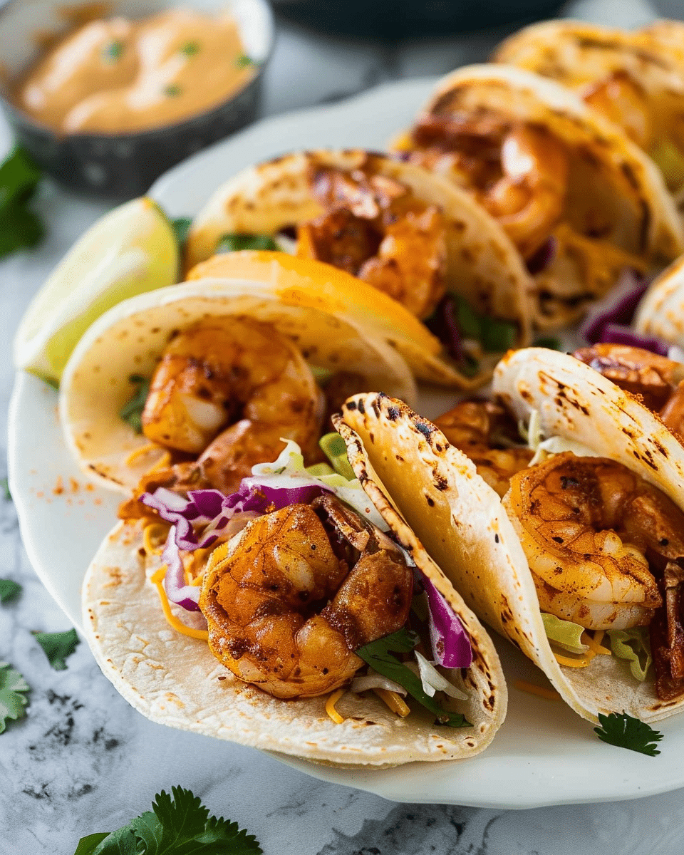 Use portobello mushrooms or cauliflower instead of shrimp for a vegetarian version.Add jalapeños or extra chipotle sauce for spicier tacos.Swap soft tortillas with crispy shells for a crunchy twist.Prep sauce and toppings ahead for quicker assembly.
