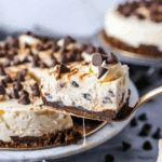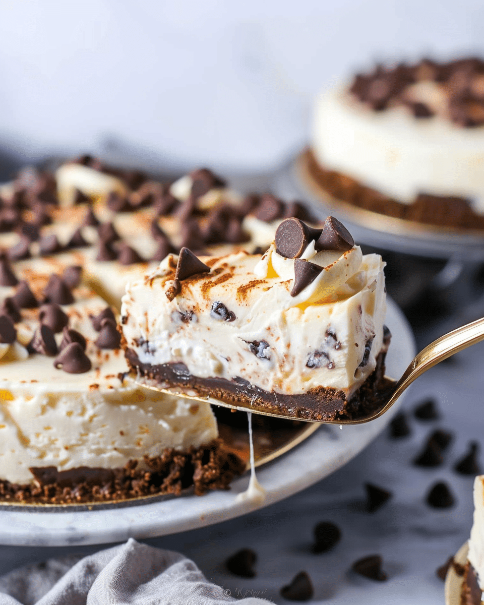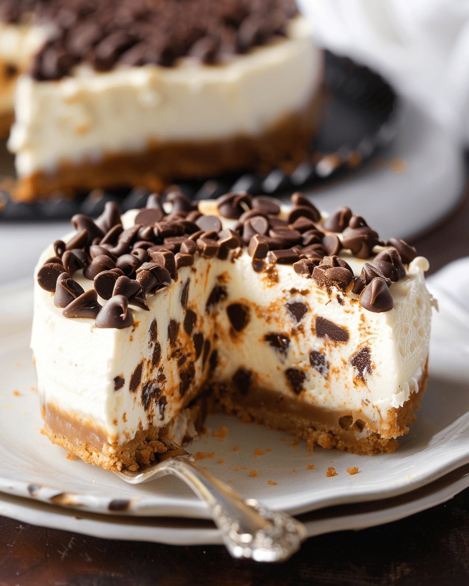 This Chocolate Chip Cheesecake features a buttery graham cracker crust, a creamy and smooth cream cheese filling, and mini chocolate chips scattered throughout. It’s a rich, indulgent dessert that’s perfect for any occasion.