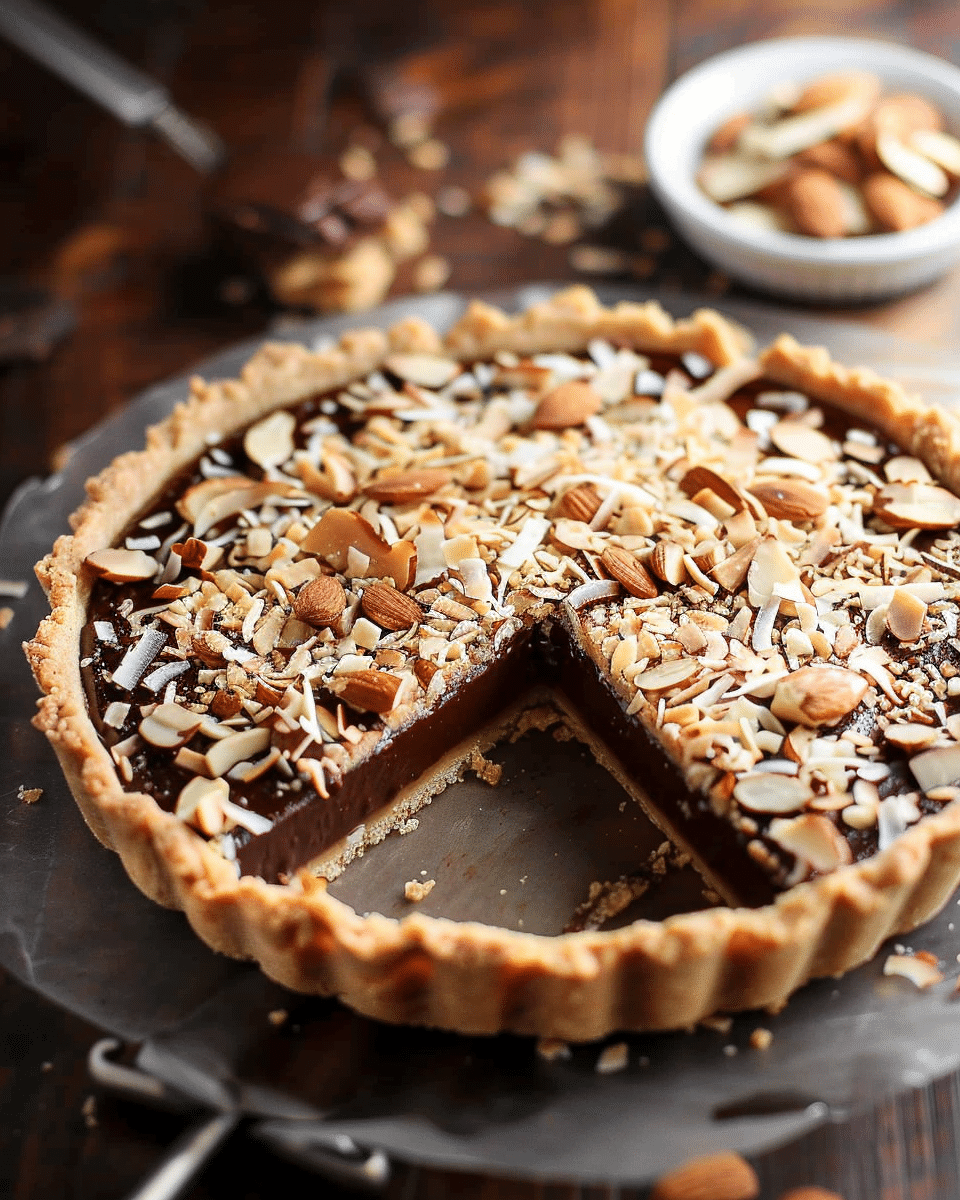 This Chocolate Coconut Almond Tart is a decadent dessert with a crunchy almond-coconut crust and a smooth, rich chocolate ganache filling. Naturally gluten-free and easy to prepare, it’s an elegant treat perfect for any occasion.