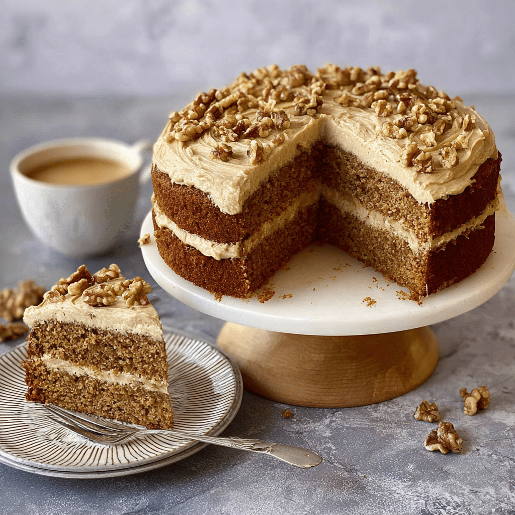 This classic Coffee and Walnut Cake features soft, fluffy sponge layers infused with rich coffee flavor and crunchy walnuts, finished with a smooth coffee buttercream. Perfect for afternoon tea or special occasions, this coffee walnut cake is a timeless, elegant dessert.