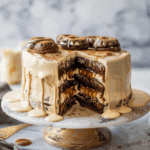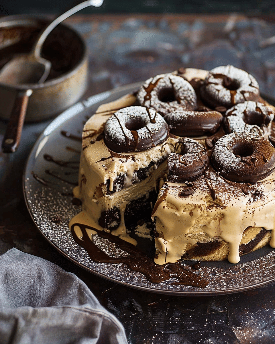 Coffee & Donuts Ice Cream Cake is a no-bake frozen dessert that combines coffee ice cream, chopped donuts, and a chocolate cookie crust. Topped with whipped cream and drizzled with chocolate syrup, it’s a playful and indulgent treat perfect for brunches, birthdays, or any celebration.