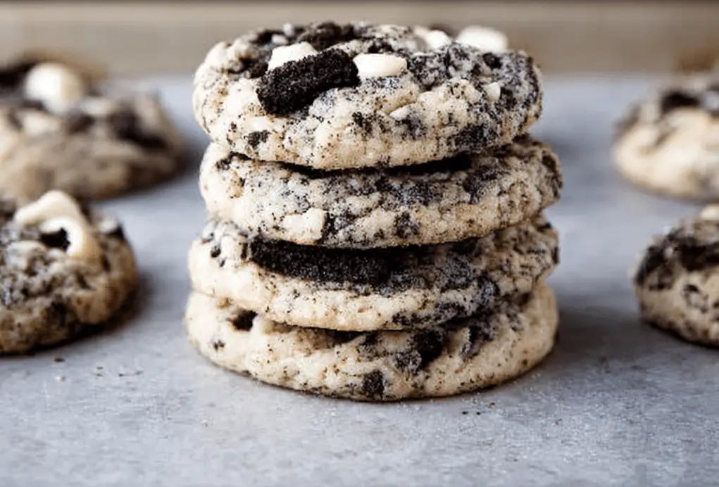 Cookies and Cream Cookies are soft, chewy cookies packed with crushed chocolate sandwich cookies and creamy white chocolate chips. They offer the perfect balance of sweet, rich, and slightly crunchy textures in every bite.