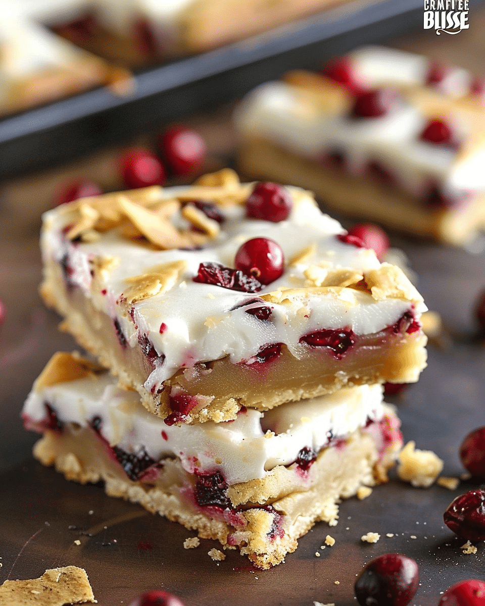 Cranberry Bliss Bars are rich, chewy dessert bars filled with white chocolate chips, dried cranberries, and warm spices. Topped with creamy vanilla frosting and a white chocolate drizzle, they’re a festive favorite that tastes just like the coffee shop version—only better.