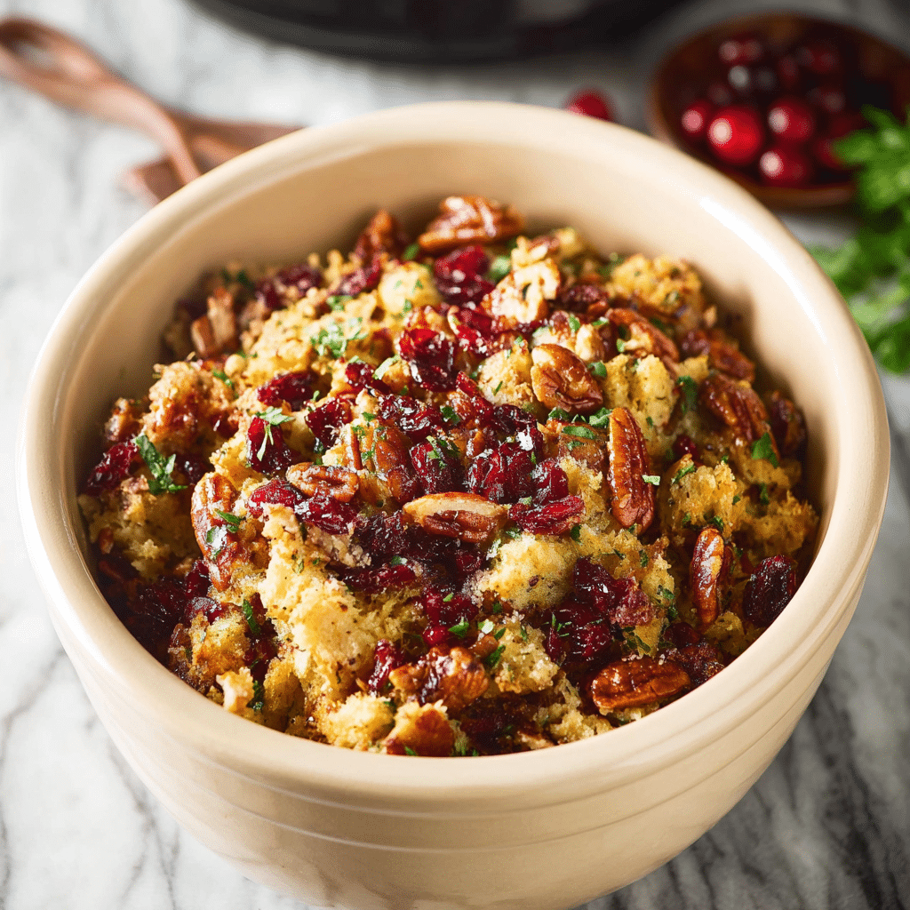 This dressing is ideal for holidays and gatherings when oven space is limited. The slow cooker keeps the dressing moist without drying it out, while the cranberries add brightness and the pecans bring a satisfying crunch. It’s easy to prepare ahead, feeds a crowd, and pairs beautifully with turkey, chicken .