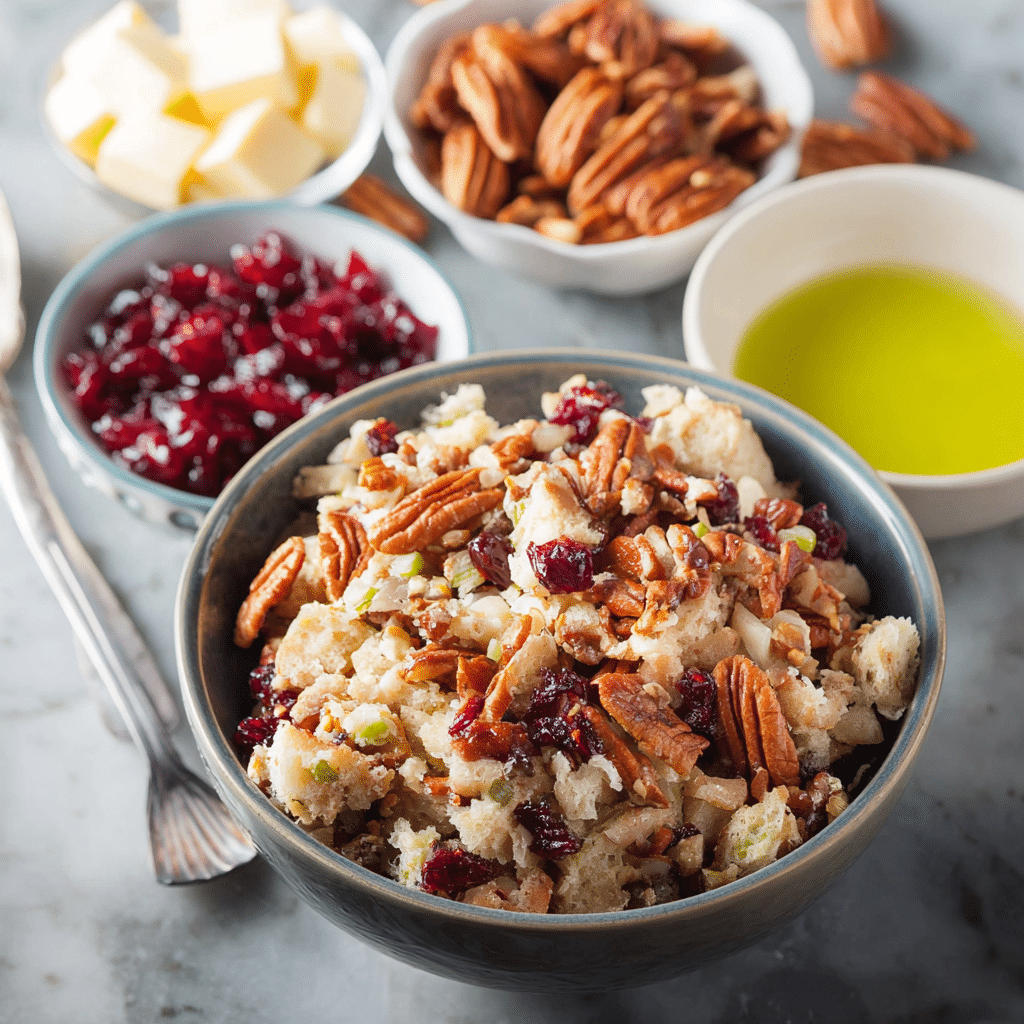 Day-old bread cubes Butter Onion, diced Celery, chopped Garlic, minced Dried cranberries Chopped pecans Chicken or vegetable broth Eggs Salt Black pepper Dried sage Dried thyme Dried parsley