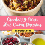 Cranberry pecan slow cooker dressing is a moist, flavorful holiday-style side dish made with savory herbs, sweet dried cranberries, and crunchy pecans. Cooking it in the slow cooker frees up oven space and delivers perfectly seasoned dressing every time.