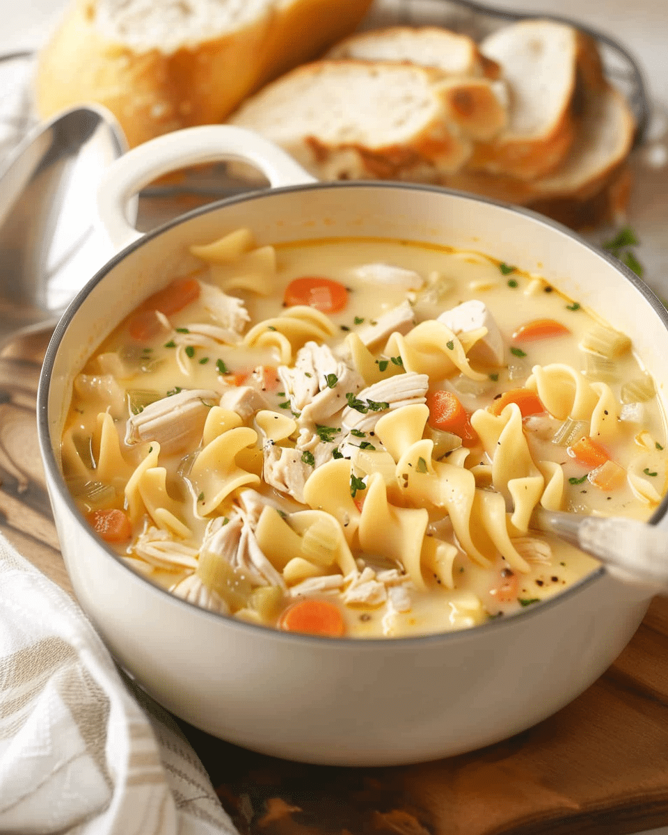 For quicker prep, use rotisserie chicken.Substitute with milk, half-and-half, or a dairy-free option for lighter variations.To prevent soggy noodles,cook them separately and add before serving.Soup thickens as it cools—add extra broth or cream when reheating if needed.Freeze without noodles and add fresh ones after thawing and reheating.