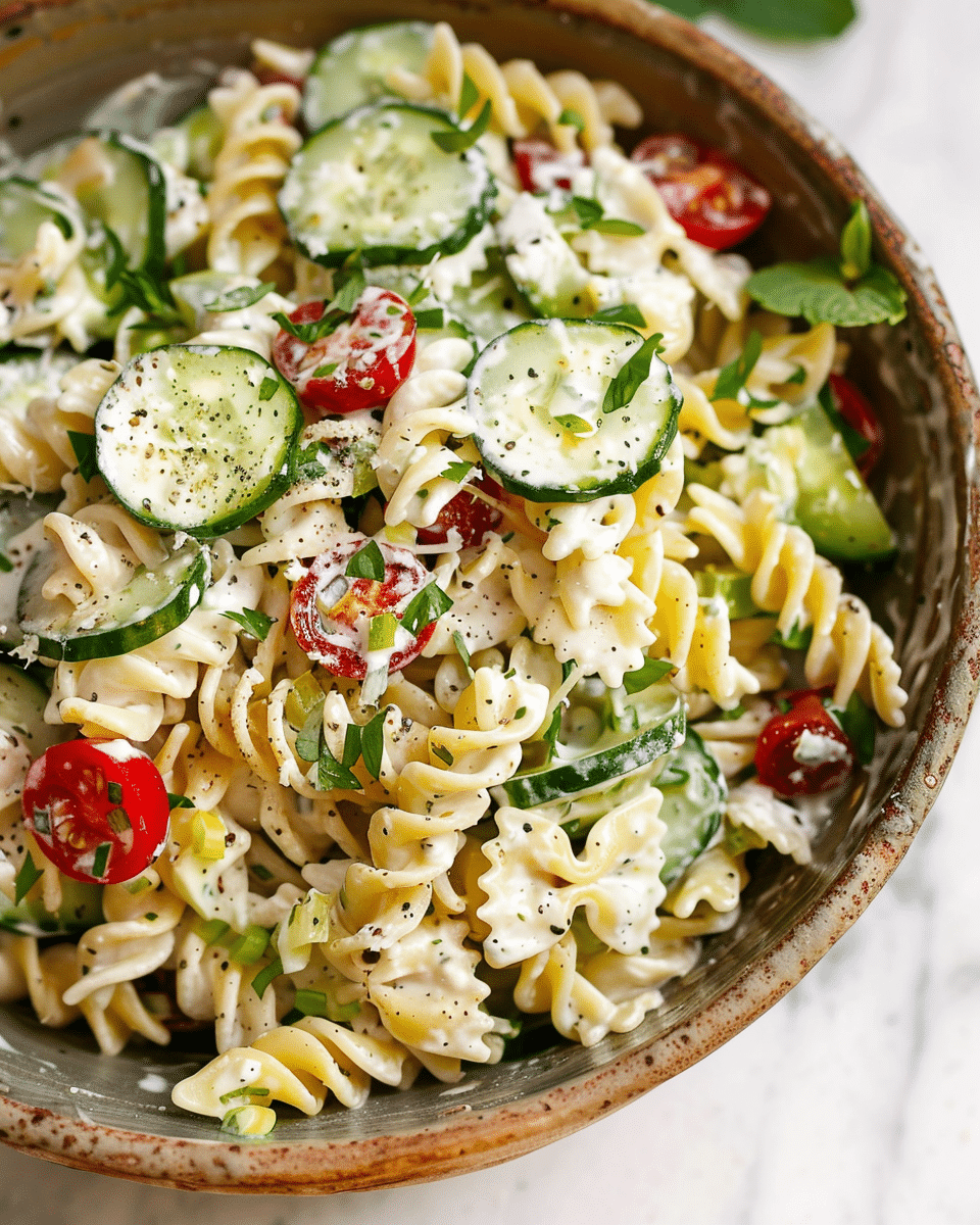 Creamy Cucumber Pasta Salad is a simple yet delicious dish that brings together the crispness of cucumbers, the richness of a creamy dressing, and the comforting texture of pasta. Whether you’re serving it at a summer picnic, a barbecue, or just for a weeknight meal, this pasta salad is sure to be a hit. With its refreshing flavors and versatile ingredients, it’s a dish everyone will enjoy!