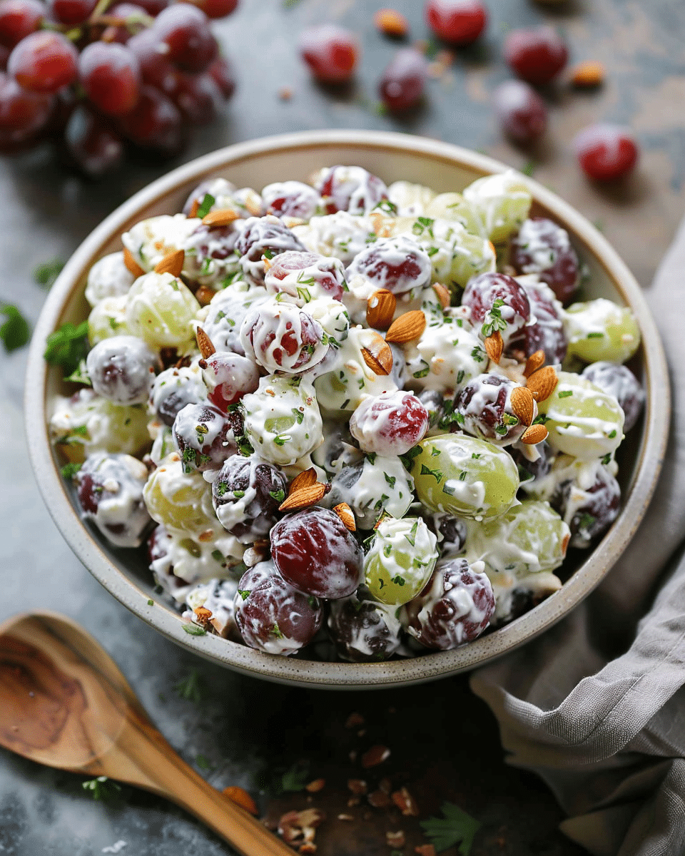 Be sure to store the salad in the refrigerator and only mix the grapes with the creamy dressing shortly before serving. This will help maintain their texture and prevent them from becoming too soft.