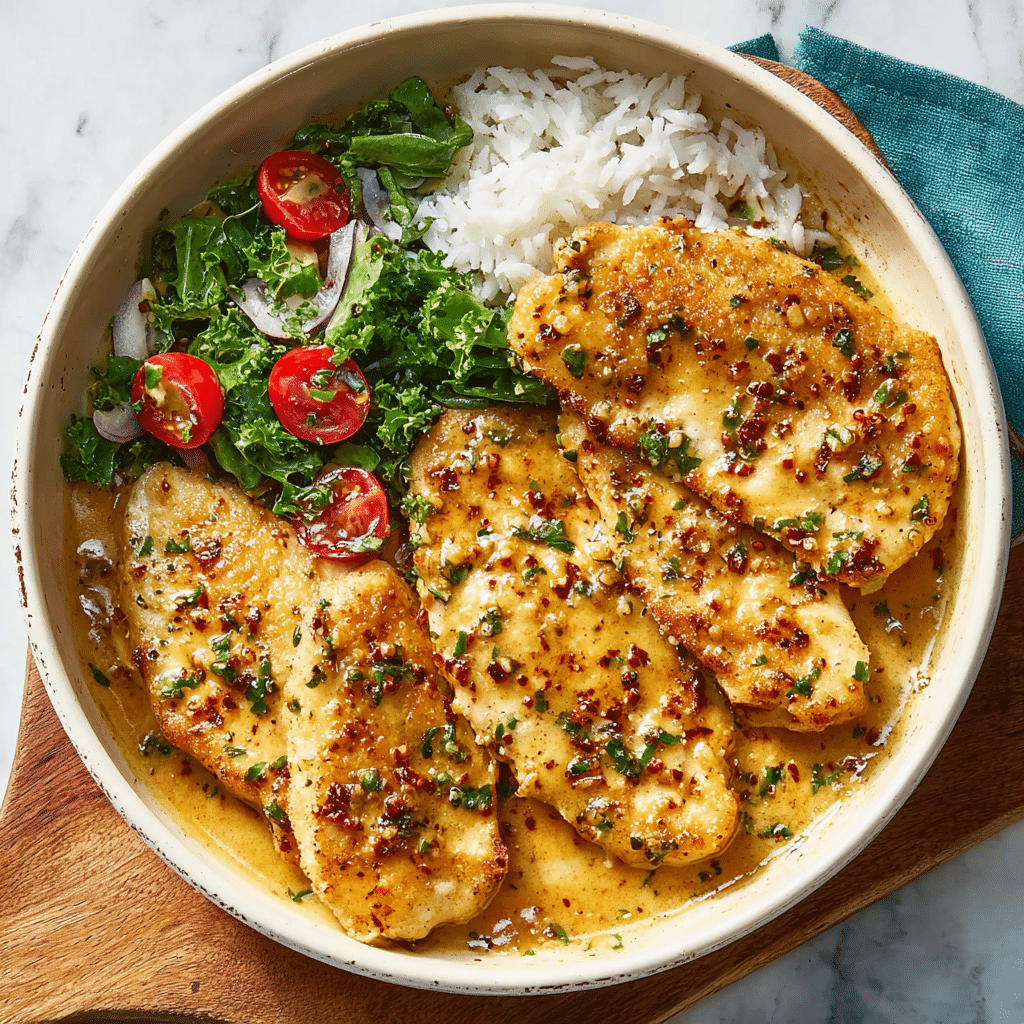 Sear the Chicken: Heat olive oil and butter in a large skillet over medium heat. Cook chicken cutlets for 3–4 minutes per side until golden brown and cooked through (internal temperature 165°F). Remove and set aside.